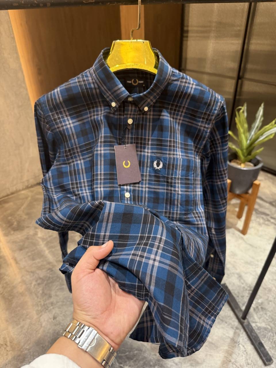 FRED PERRY GREY BLUE CHECKS OXFORD COTTON SHIRT