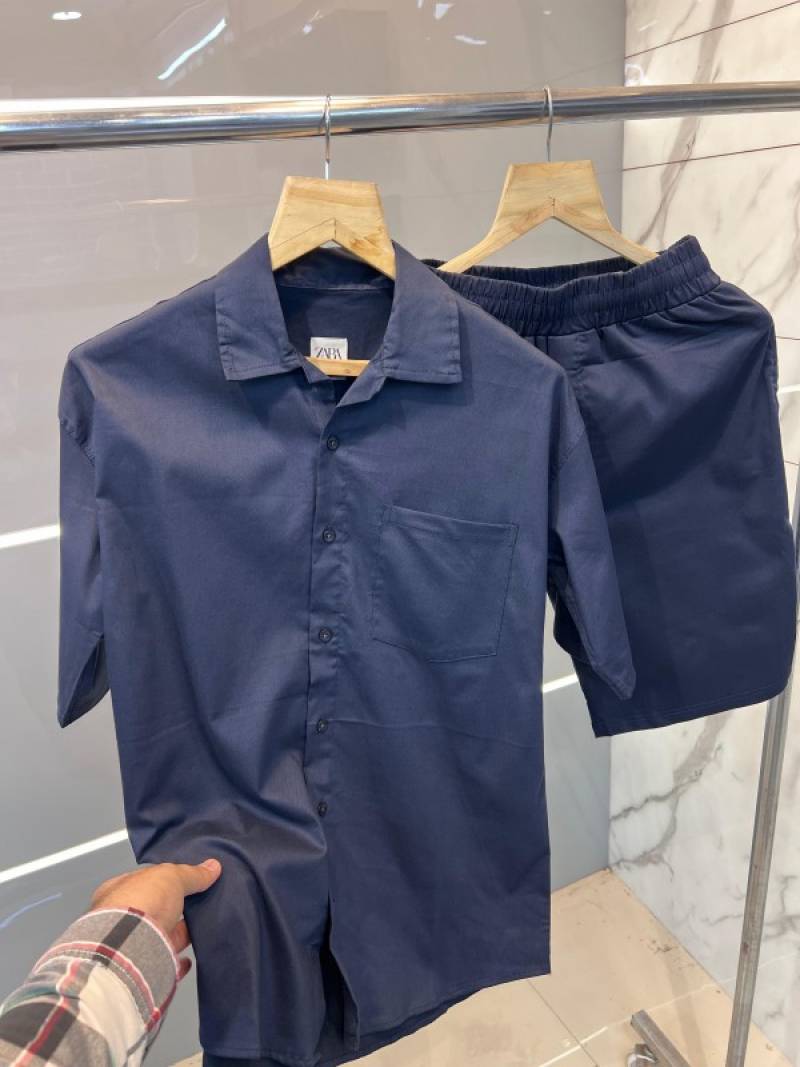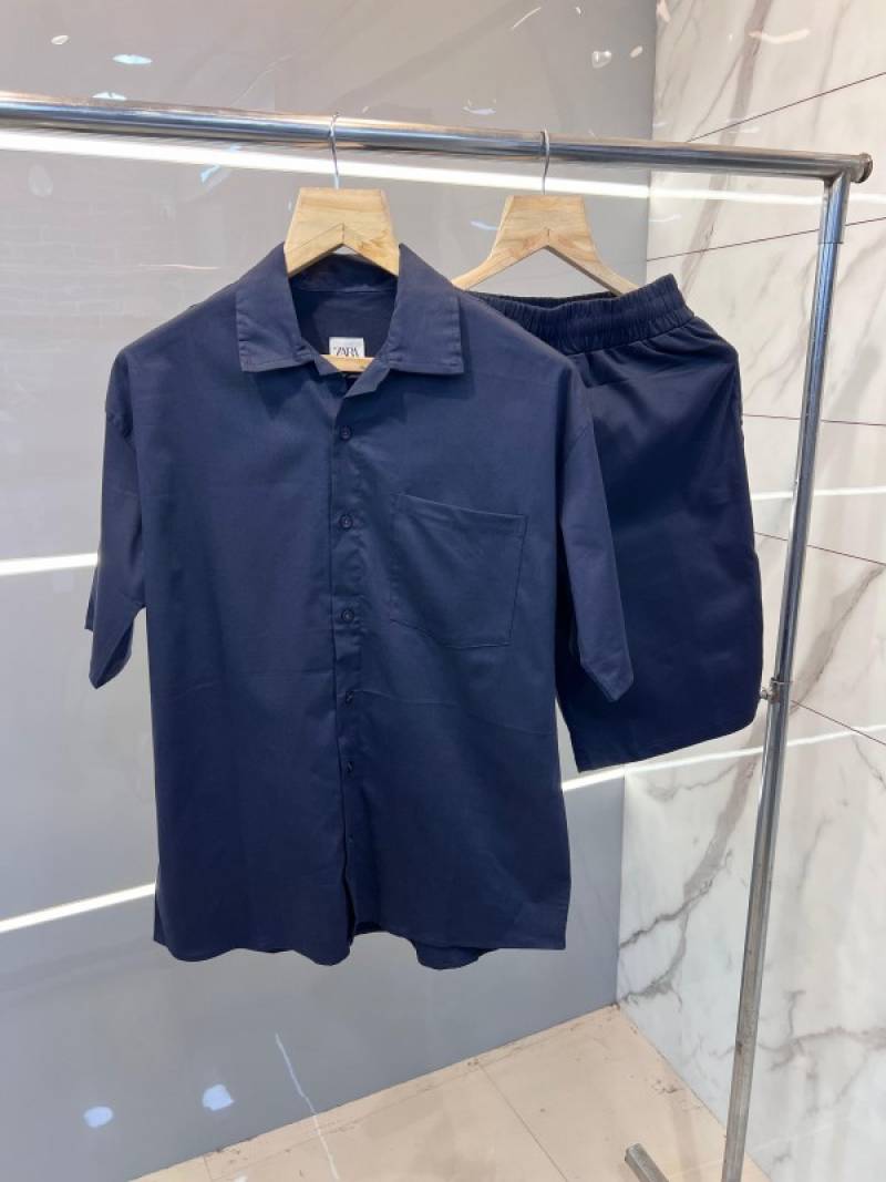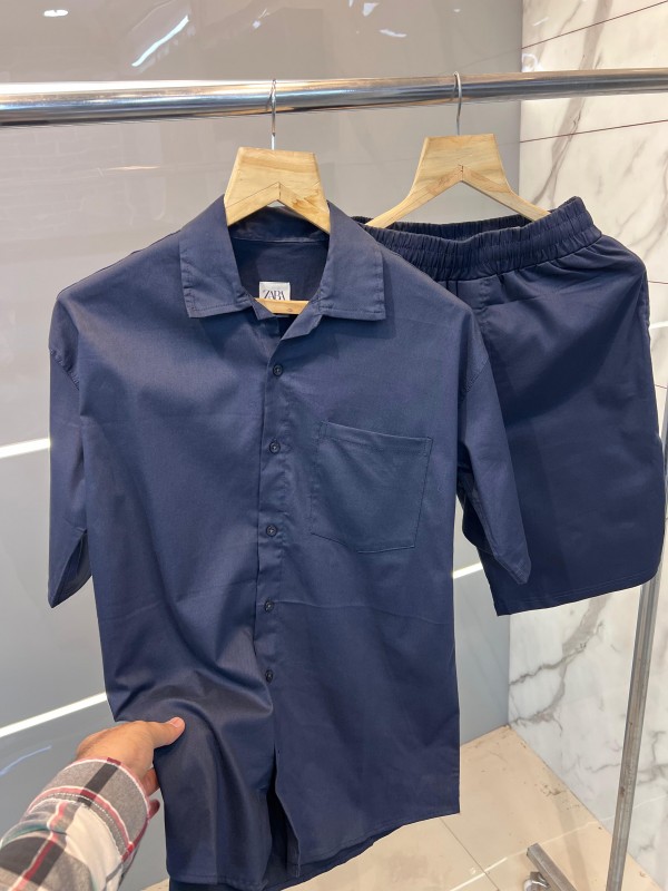 Zar a Navy Premium Imported Cotton Lycra Fabric Cuban Collar Cord Set with Carry Bag 2343